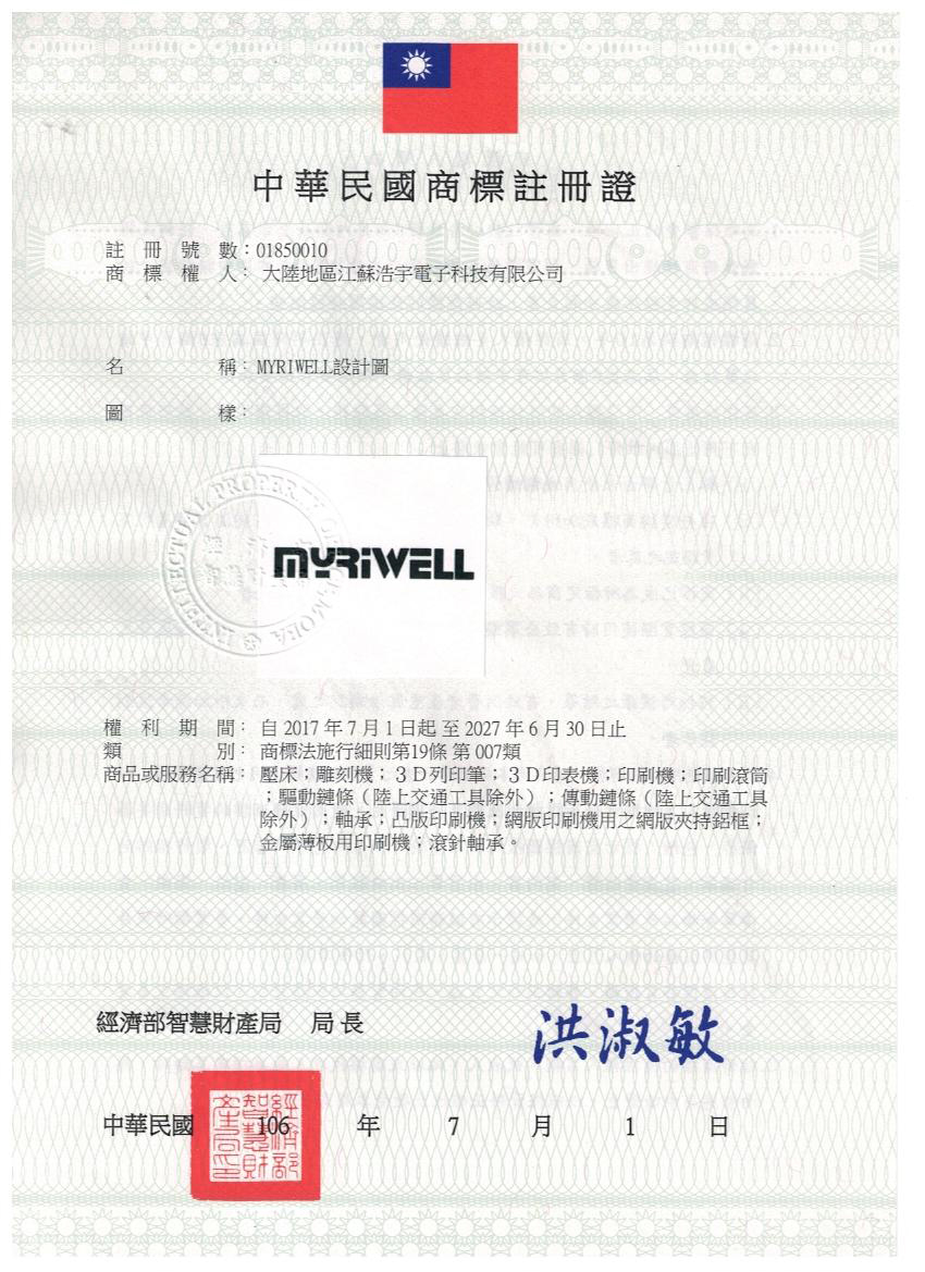 热烈祝贺江苏浩宇电子科技有限公司迈睿"MYRIWELL"商标在台湾注册成功!